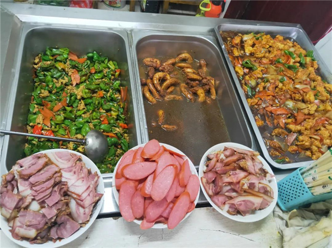 職工們發(fā)現(xiàn),車隊(duì)的職工食堂今天的伙食比往常額外增加了“硬菜”,有豬頭肉,香腸、熘肉段,醬雞脖、青椒炒雞蛋等菜品,職工們第一時間吃上醬香的豬頭肉,特別高興。