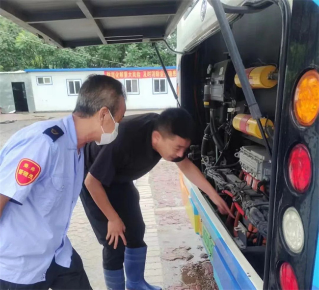 通利公司所屬車隊召開防汛會議,管理人員來到運營線路巡視,查看行車及積水情況,并對駕駛員進行出車前的安全提示。