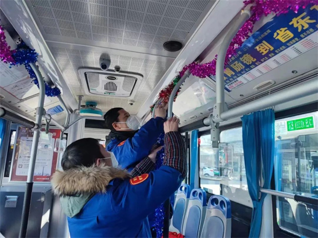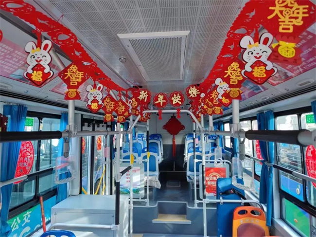 在209路車隊,車廂、站務室、辦公區(qū)域處處洋溢著喜慶的中國風,生肖窗花張貼在車窗兩側(cè),可愛的卡通兔“微笑”著向乘客們送著“祝福”,“新年快樂”的拉花昭示著中華民族的傳統(tǒng)佳節(jié)即將到來。