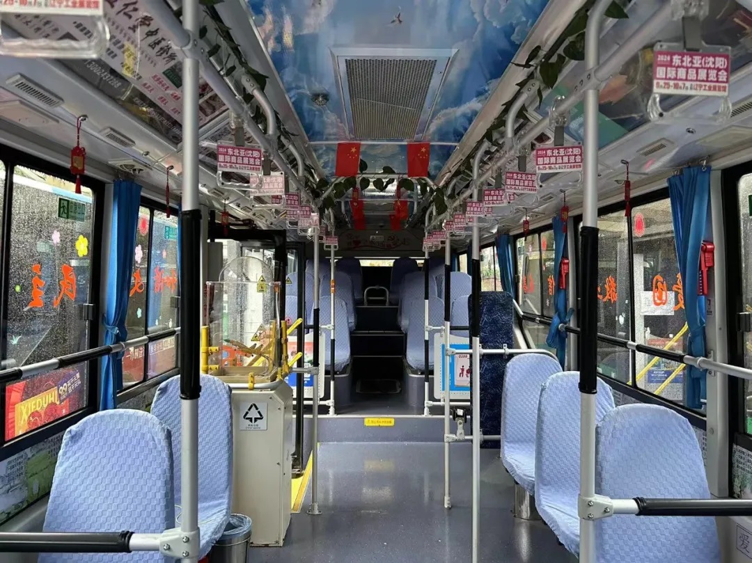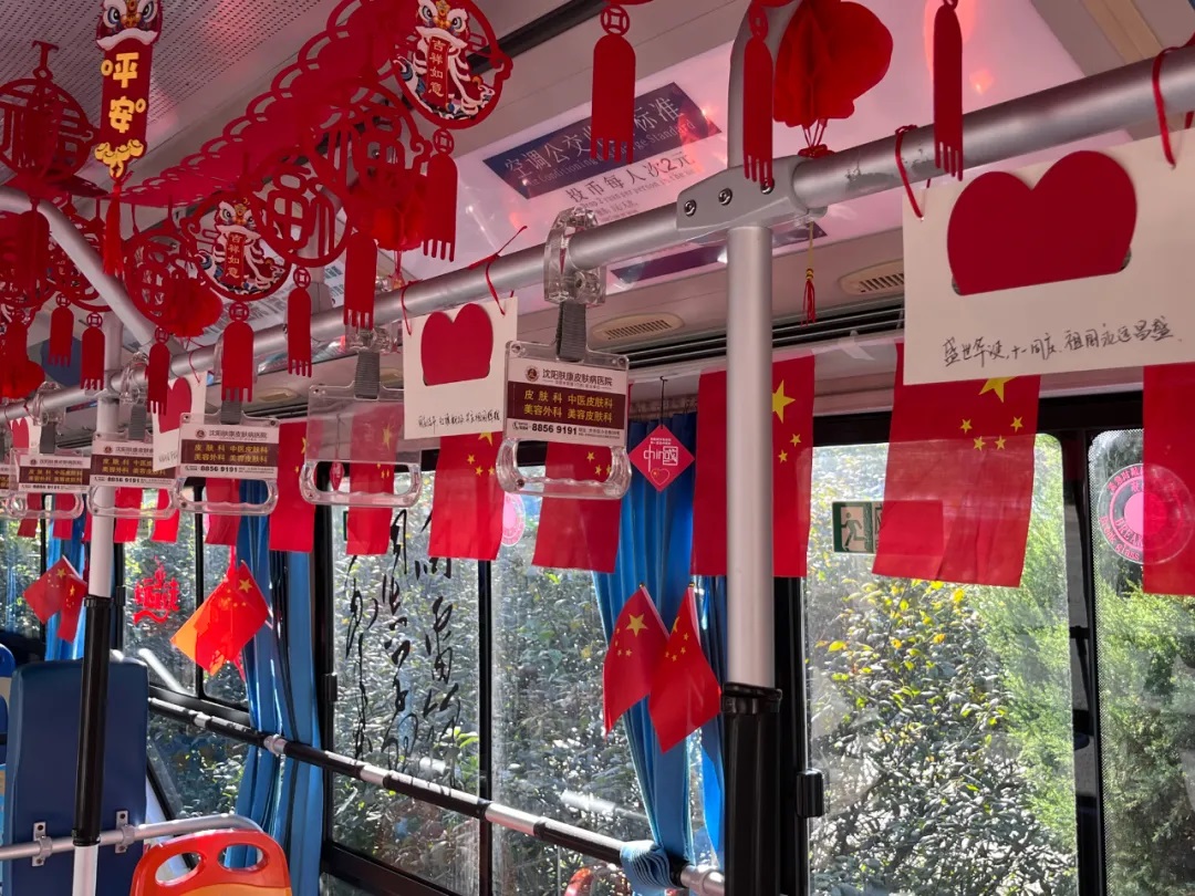 場面三:在沈陽市勞動(dòng)模范、260路駕駛員繆立眾的車廂內(nèi),紅彤彤的國旗懸掛車廂兩側(cè),一句句祝福寄語祖國,讓市民在乘車時(shí)也感受到濃厚的愛國情懷。