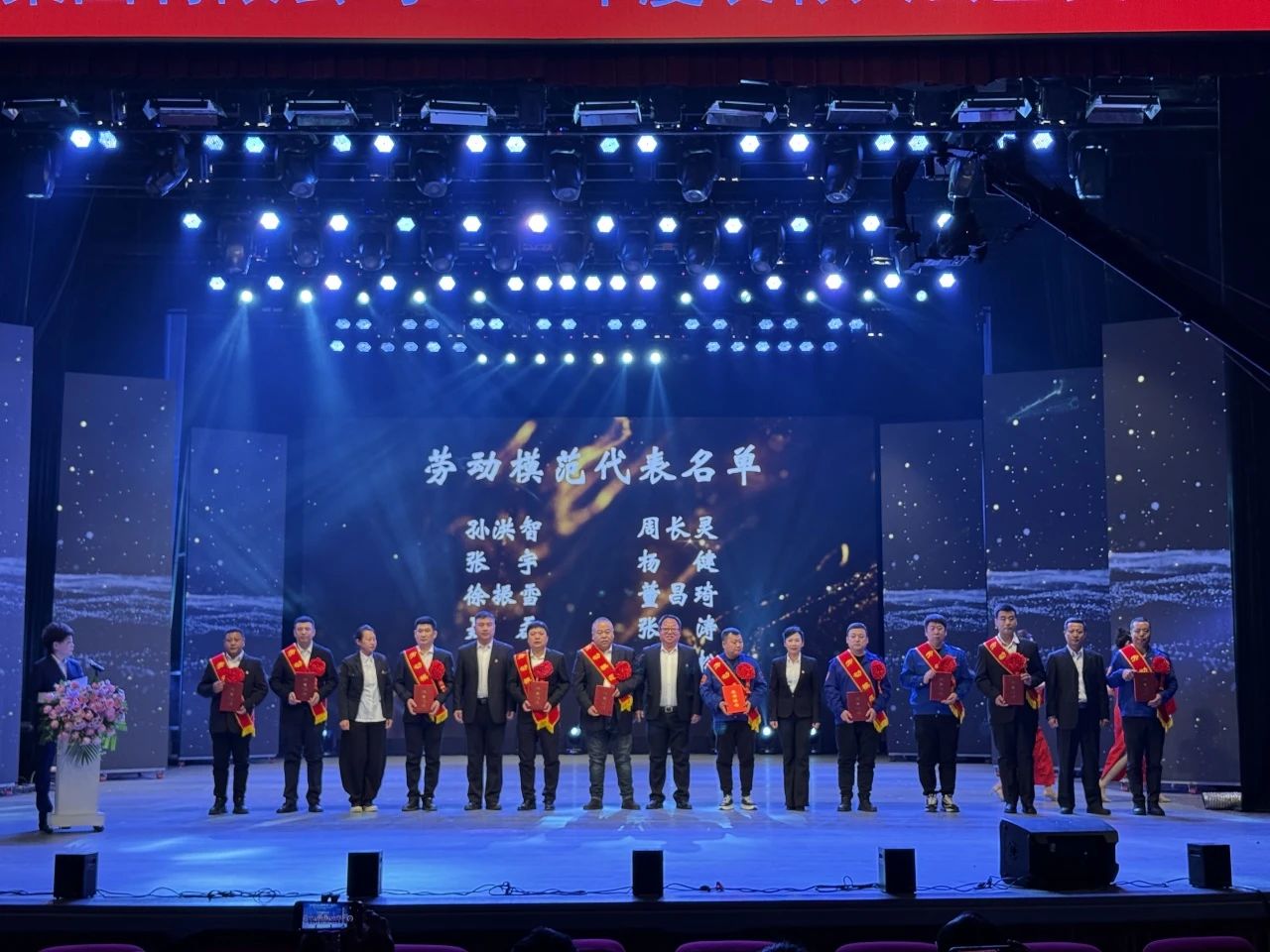 勞動(dòng)模范代表上臺(tái)領(lǐng)獎(jiǎng)