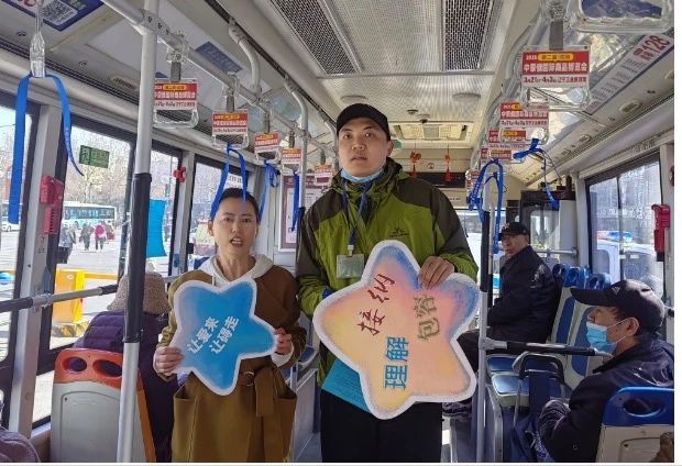 活動中,志愿者們精心布置公交車廂,懸掛象征關(guān)愛的藍(lán)色絲帶,通過車廂內(nèi)“孤獨(dú)癥兒童乘車行為習(xí)慣”主題宣講,向市民普及“多一份等待、少一次催促”的包容理念。